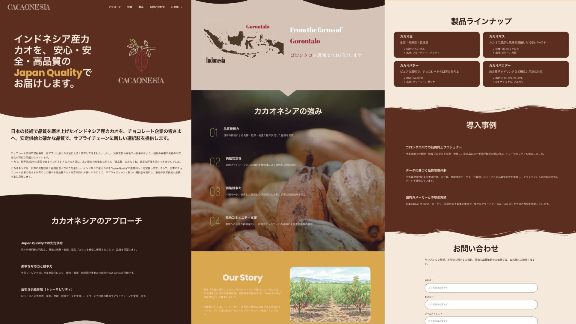 インドネシア産カカオを、日本市場向けの最高級原材料「ジャパン・クオリティ」として視覚的に定義すること。情報提供に留まらず、「ウェブサイトがチョコレートのように美味しそうに見えること」を意識しました。